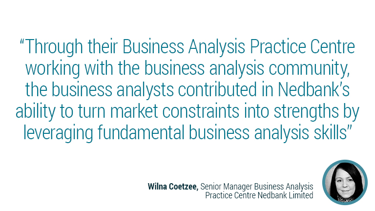 Fulfilling Nedbank’s mandate to deliver innovative customer experiences keeps their business analysis practices focused on continuous improvement. Working with the bank’s Learning and Development team the BA Practice Centre has aligned their business analysis roles and career paths with IIBA’s Business Analysis Competency Model and built their Business Analysis framework to align with the IIBA Guide to Business Analysis Body of Knowledge (BABOK® Guide) and the Agile Extension to the BABOK® Guide so that all business analysts across the organization are working within the same standards that are widely communicated through their community of practice and share that knowledge enterprise-wide.